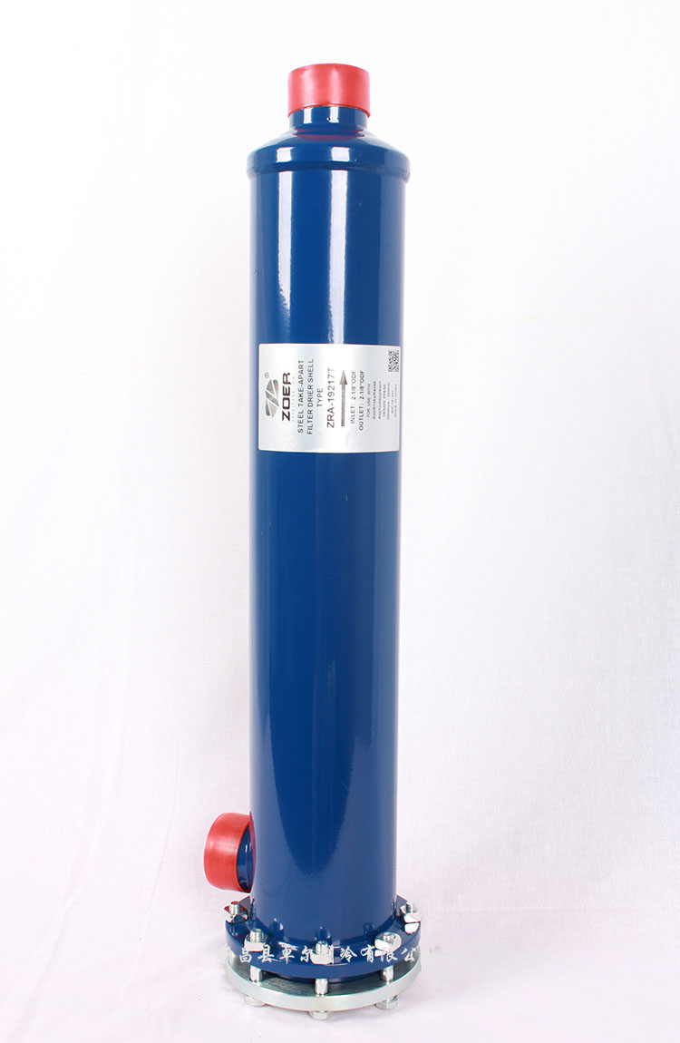 ZRA take-apart filter drier with exchangeable solid core uses the flange connection to seal. That is very convenient to adjust and maintain the equipment. This steel liquid and suction core shell is especially suitable for use in conditions where compressor damage has occurred or heavy ingress of water in the system. It has super cleaning and absorption abilities (to be equipped the available cores). It can be used in the liquid line and suction line of the refrigeration system for cold storage and air adjusting equipment.